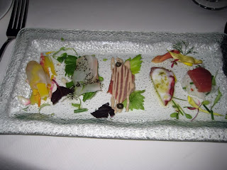 Il Grano is a sleek Italian restaurant in West LA which focuses on fresh ingredients with an emphasis on seafood. The ambiance is clean, modern, quiet, and pretty. We didn't feel like thinking about what to order so we told the server to put together 2 five course meals for us. They have a full bar and a nice wine selection, but I was going alcohol free this evening.Service was quick, and somewhat attentive, but boring. No one had personality, but I guess that's just me nit picking.