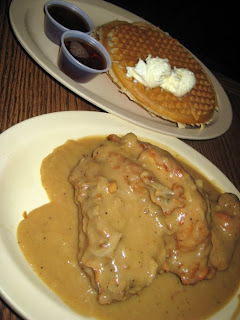 The portions here are HUGE, no joke.#2The chicken was dry on the inside, soggy on the outside. I'm guessing I should've ordered the dark meat. The waffles were soggy and rubbery. The butter was actually the best part. They have some nice sweet creamy butter. The syrup was standard.