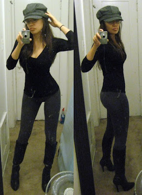 What I wore to 'scoe's...Very haggard simple every day look. No makeup, just nude gloss. I didn't even comb my hair. I'm sure you can tell. =P Top-bebe. Leggings-f21. Boots-steve madden. Hat-Target. I've been sleeping and eating lots of junk. The weight goes straight too my booty and thighs. I'll cut carbs for a week starting tomorrow before things get out of hand. =P